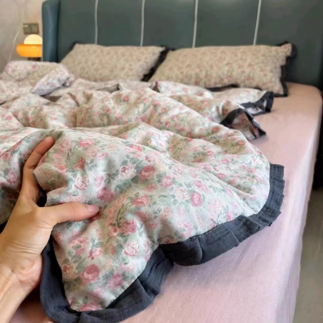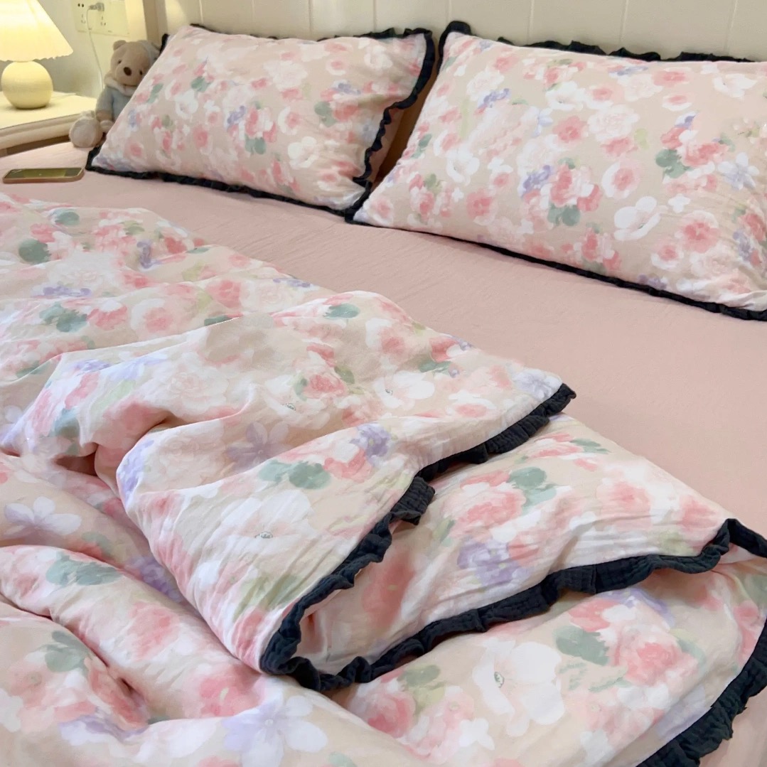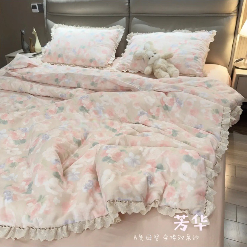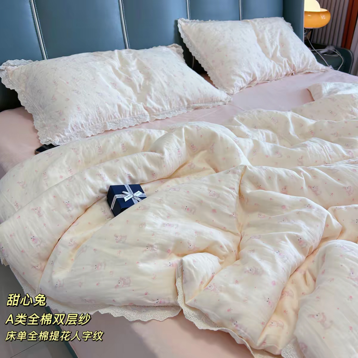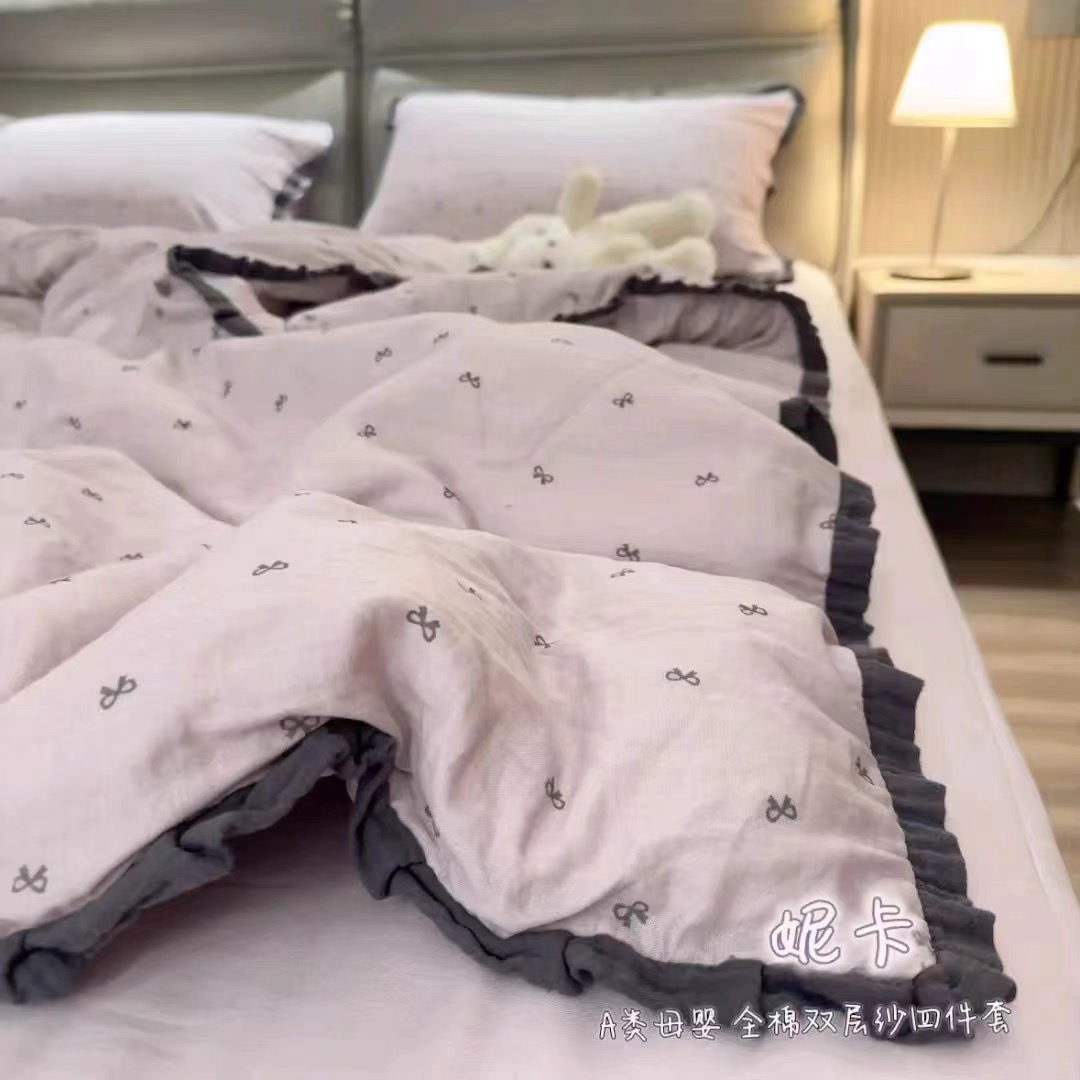 > A类母婴级全棉双层纱床上四件套法式皱皱花边纯棉被套床单三件套