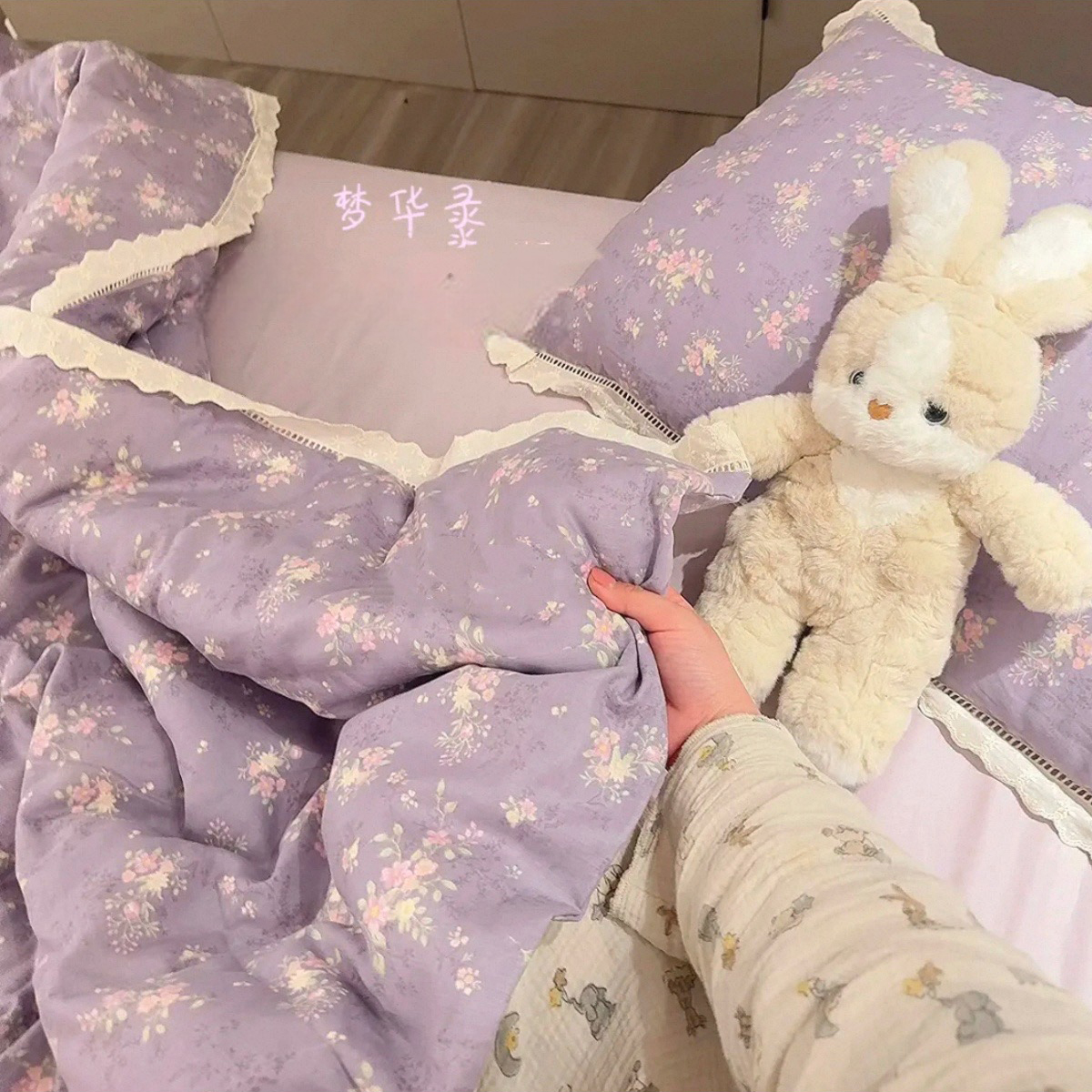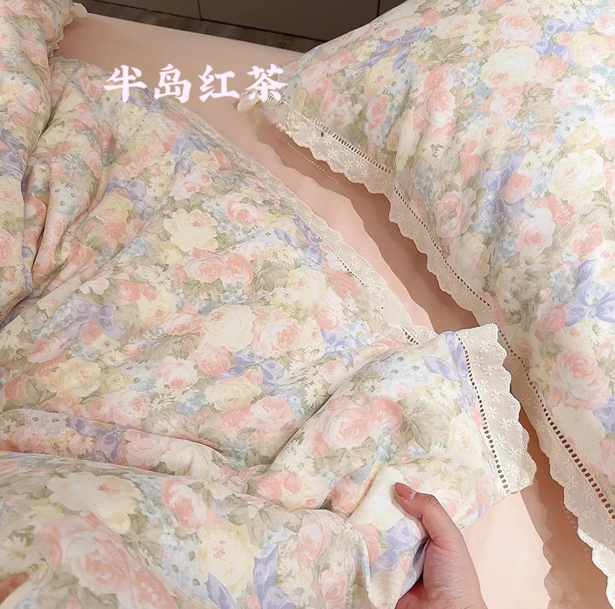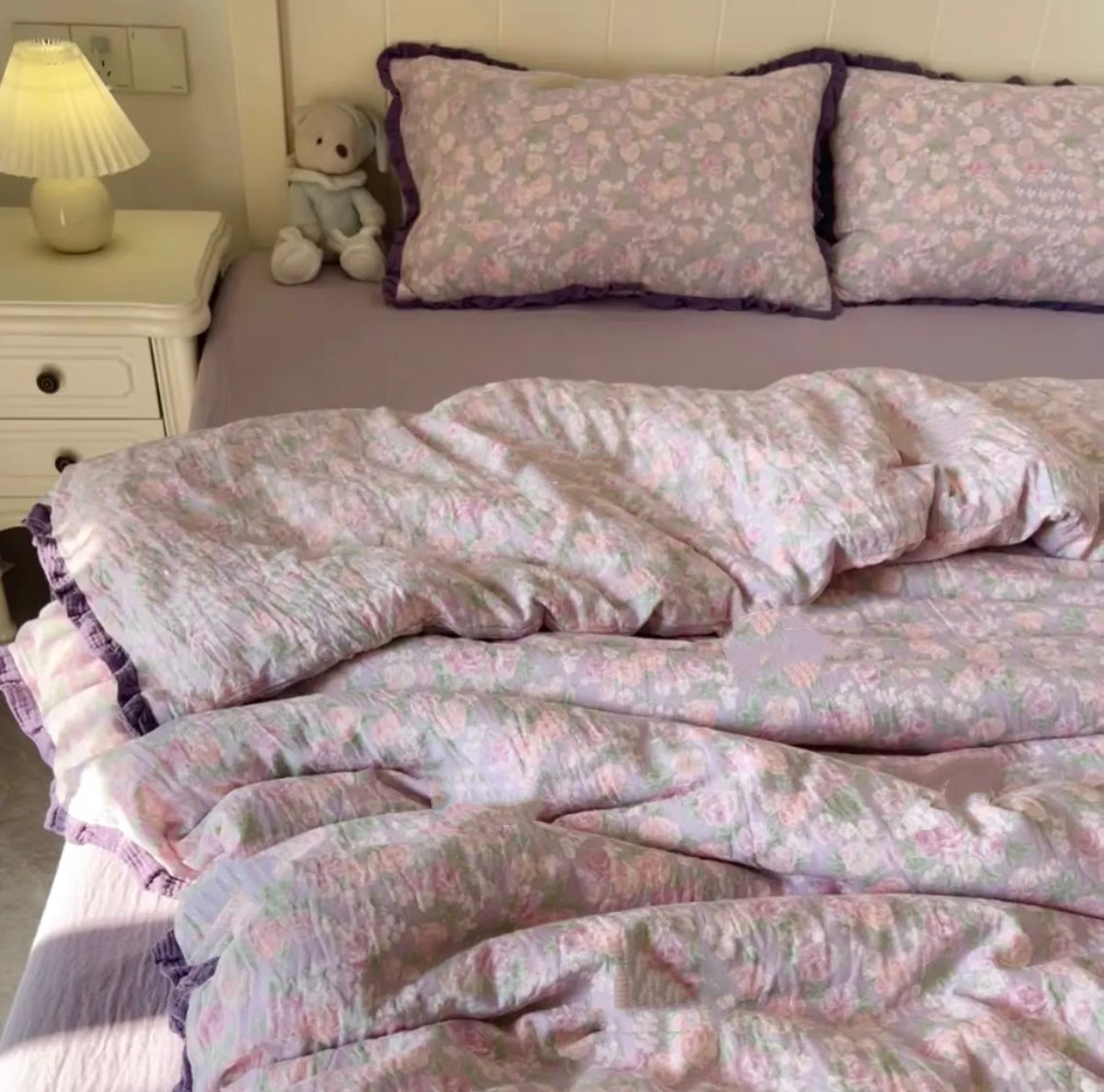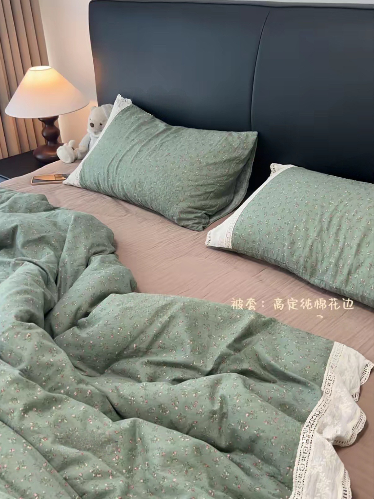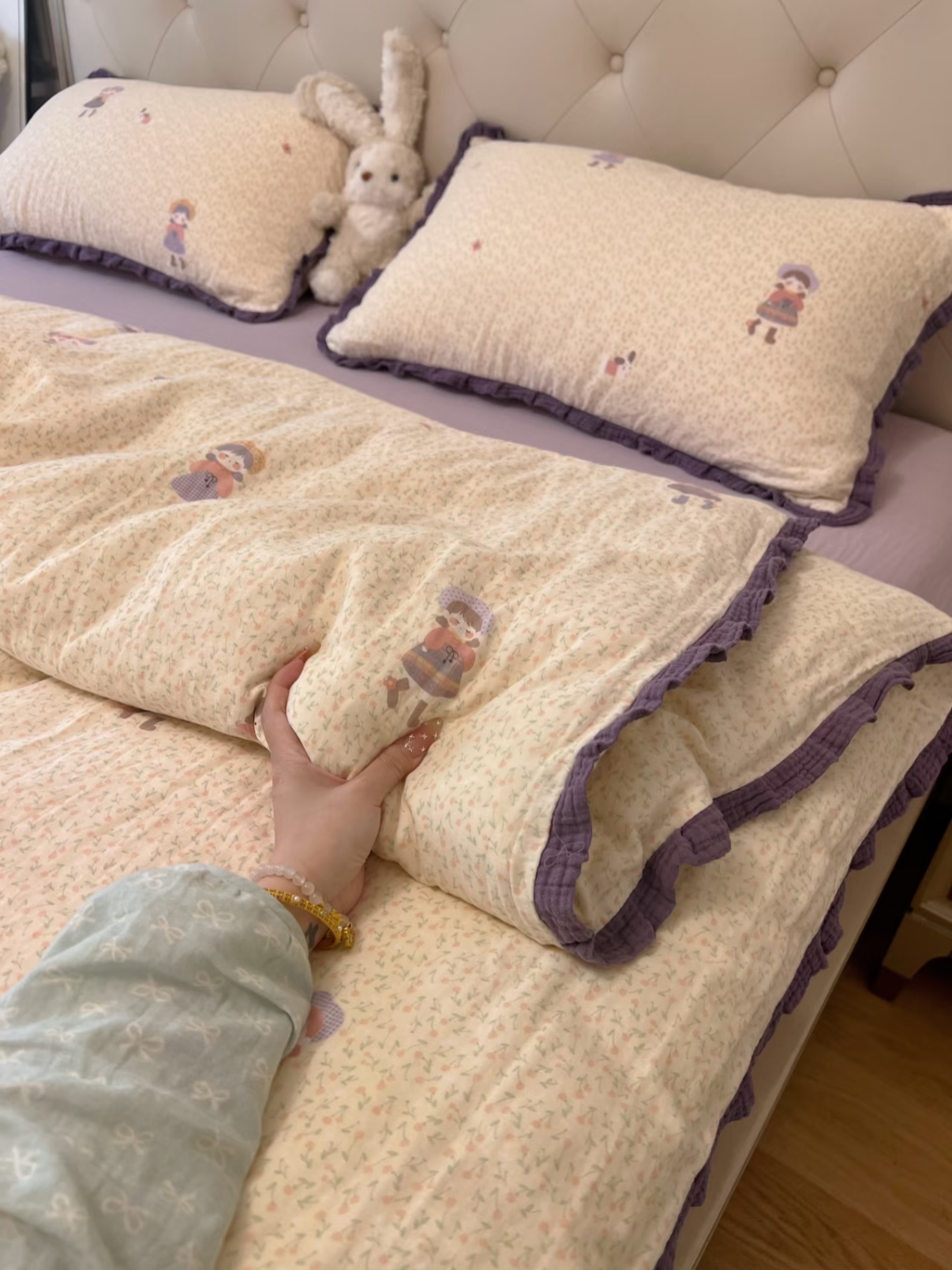 > A类母婴级全棉双层纱床上四件套法式皱皱花边纯棉被套床单三件套