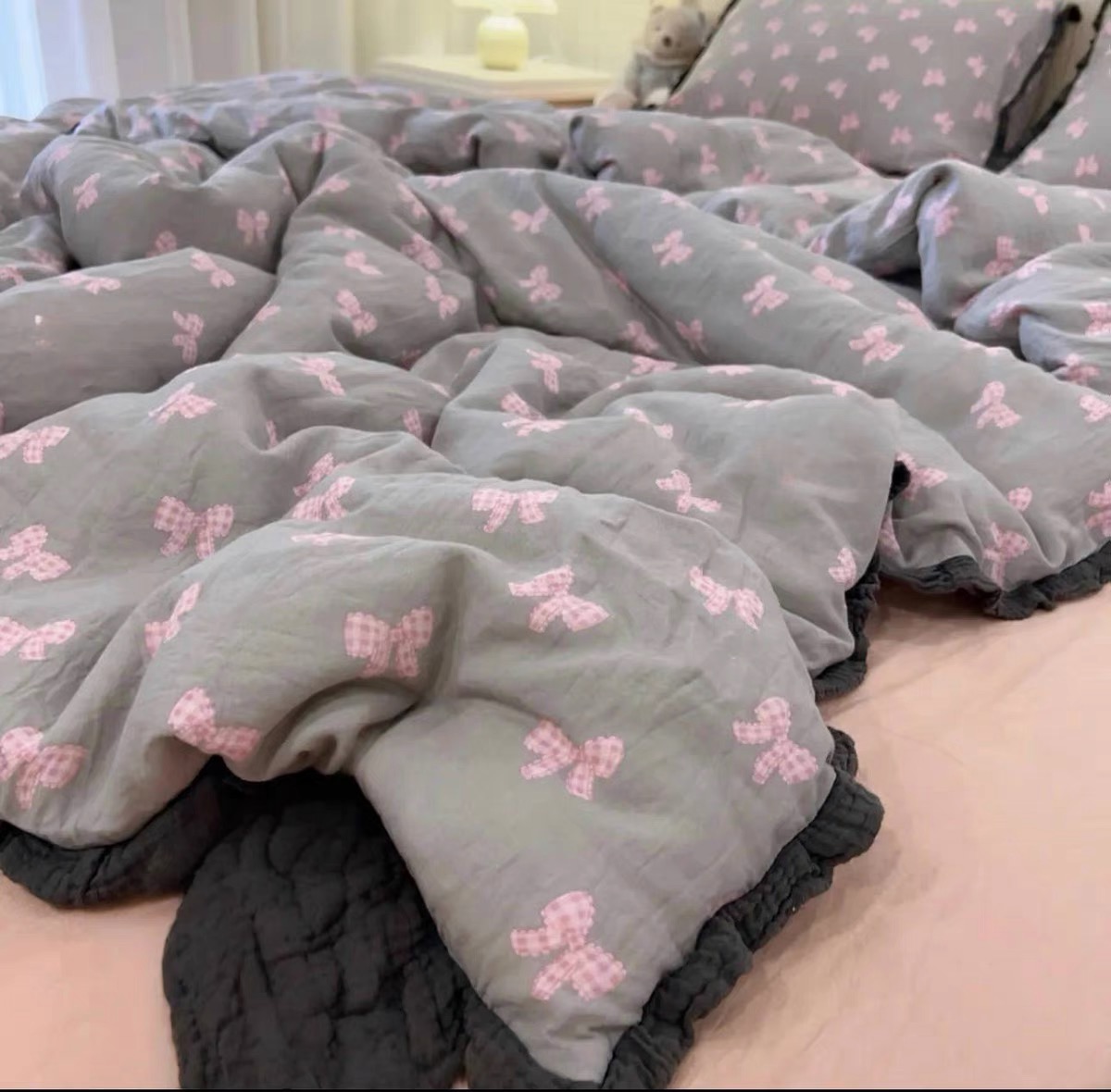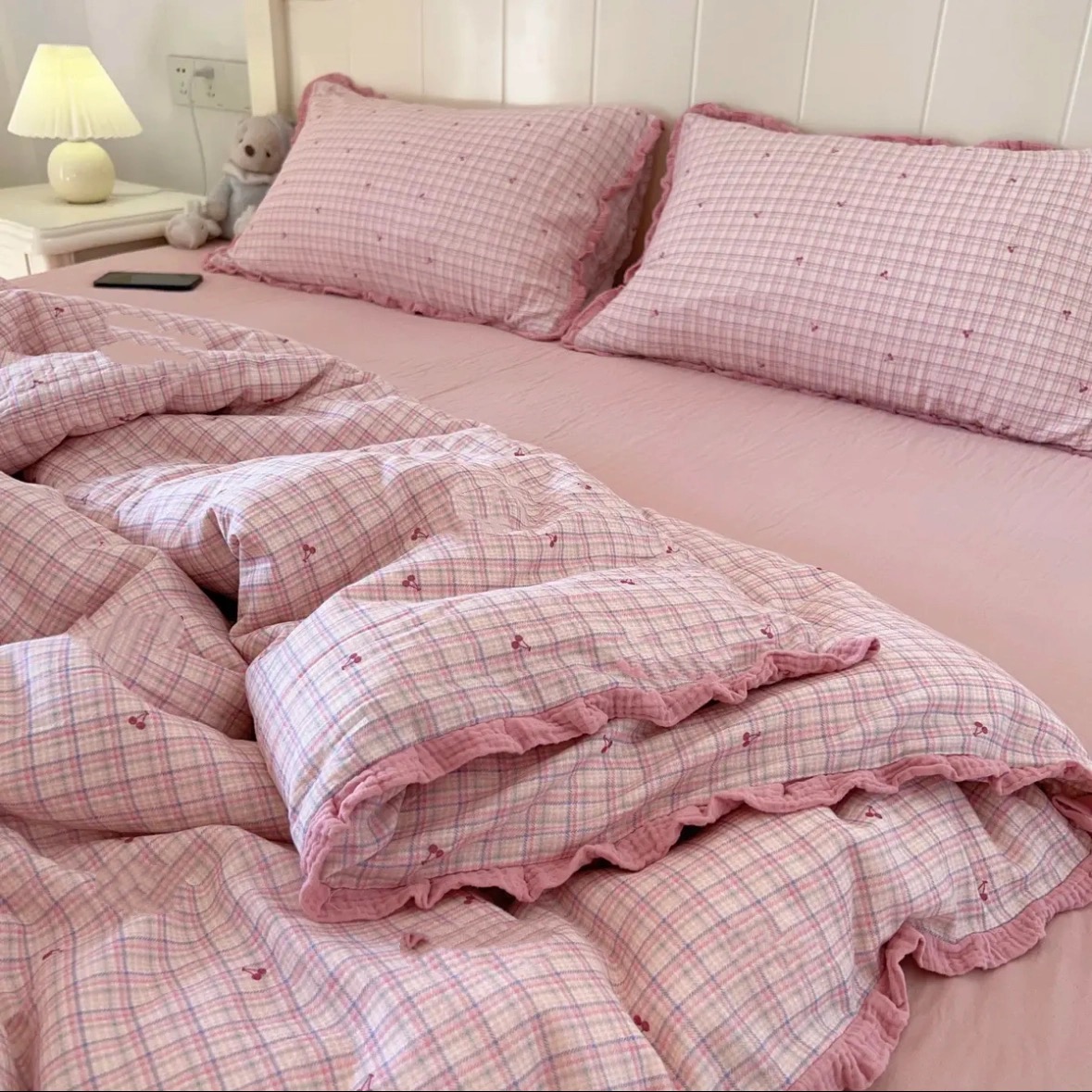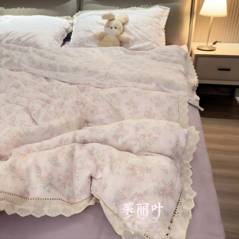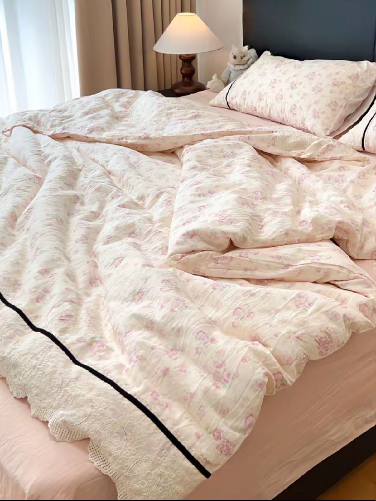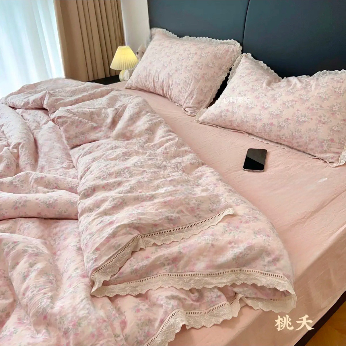 > A类母婴级全棉双层纱床上四件套法式皱皱花边纯棉被套床单三件套