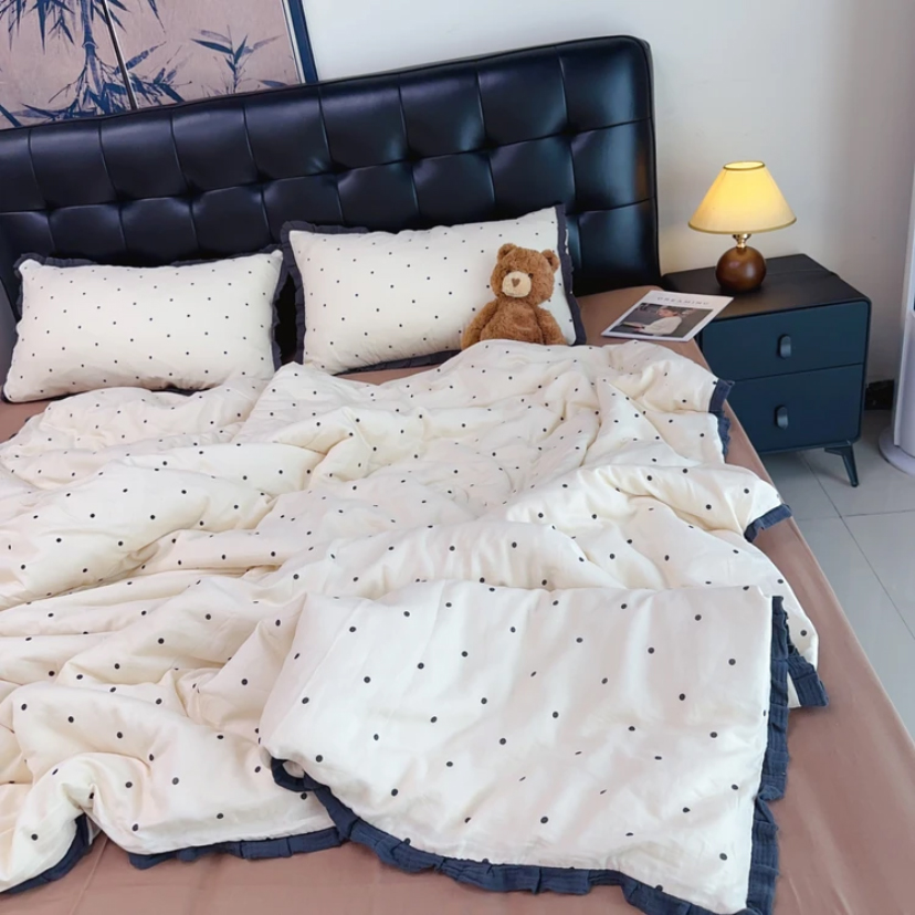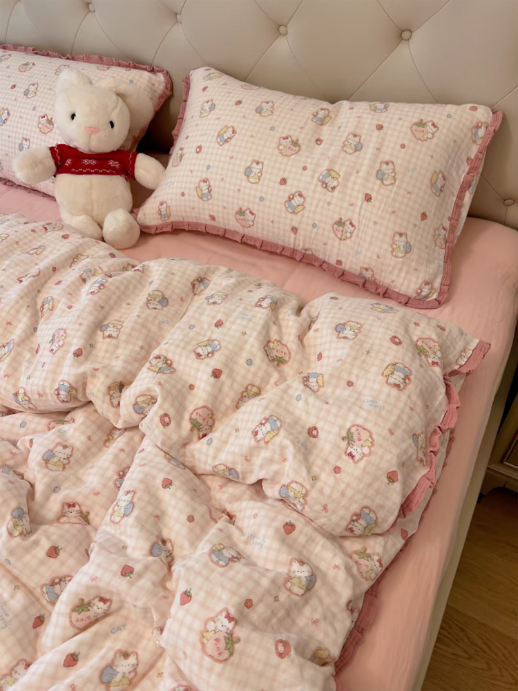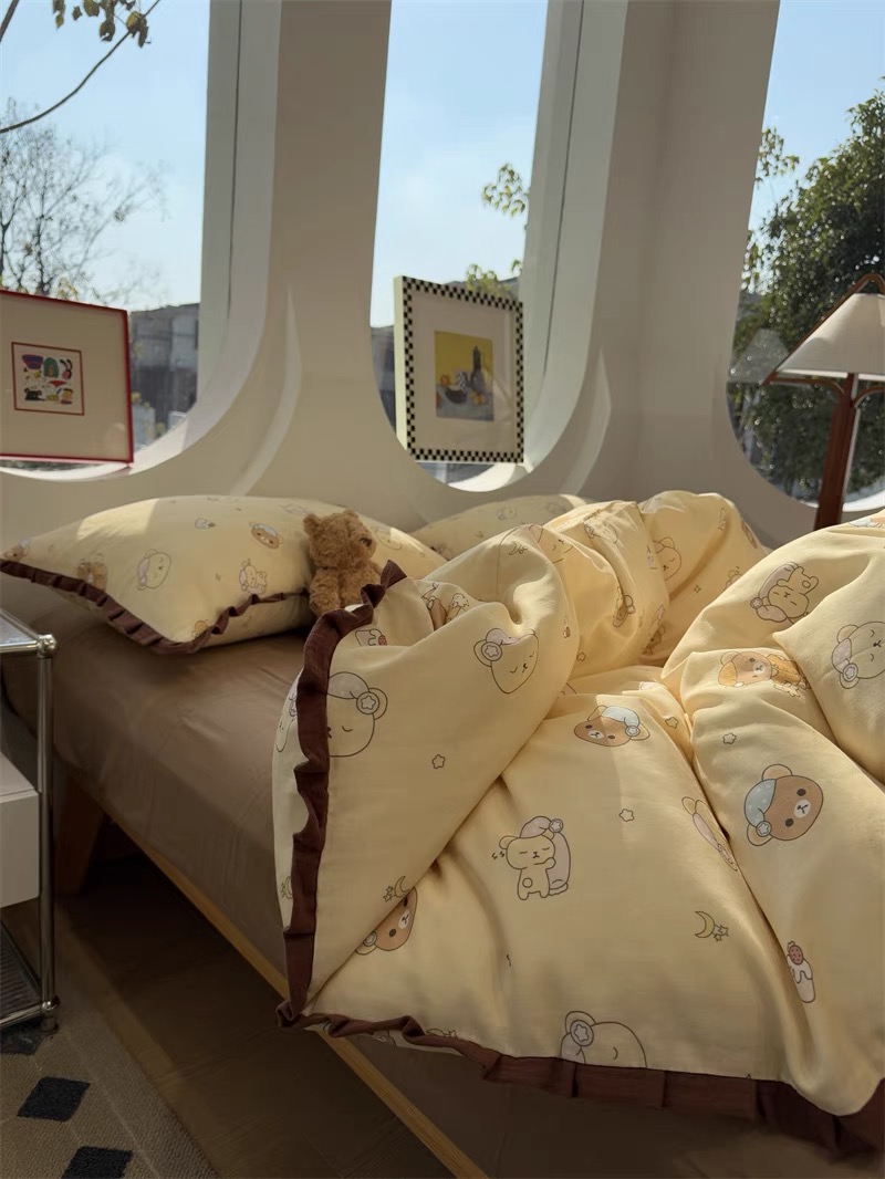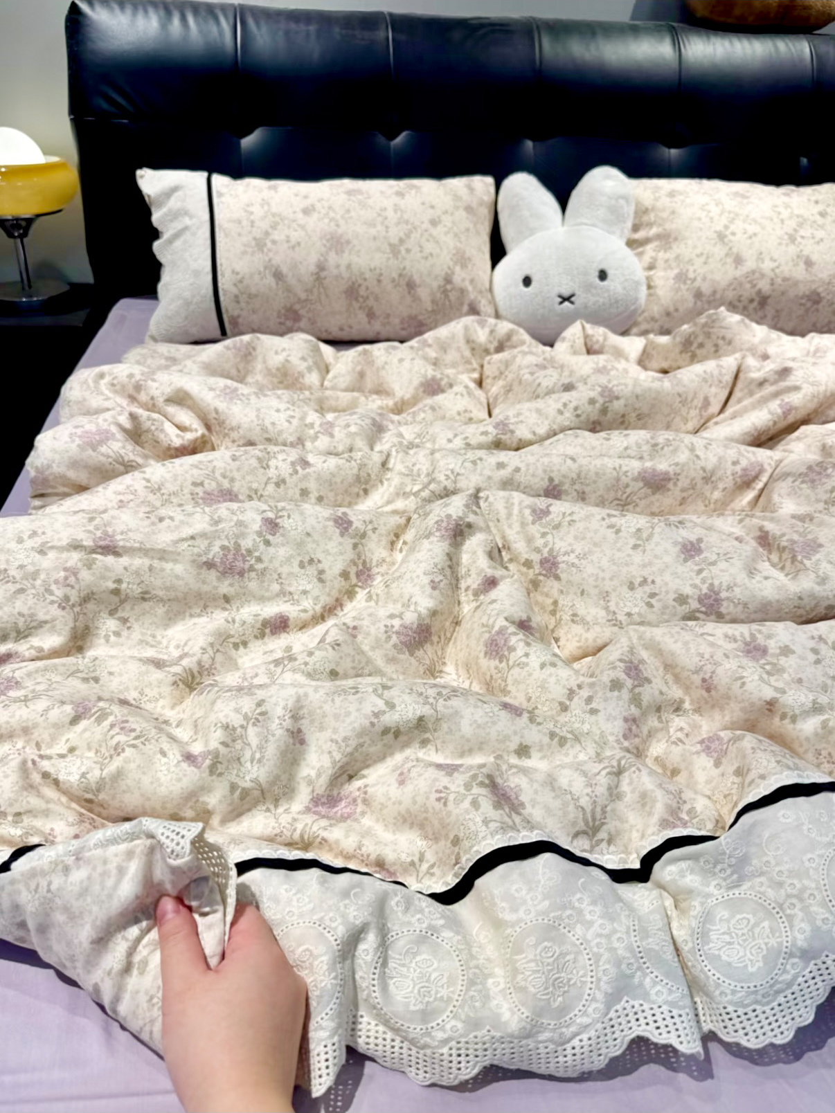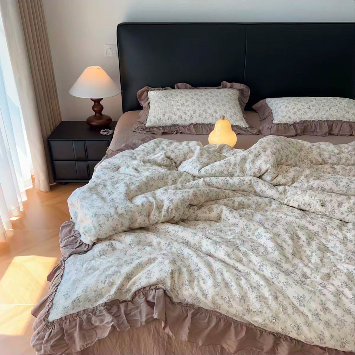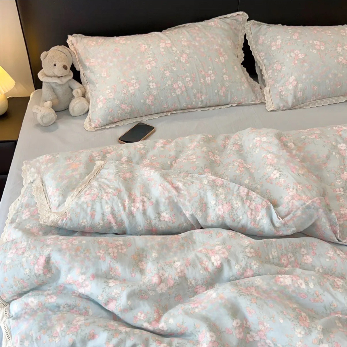 > A类母婴级全棉双层纱床上四件套法式皱皱花边纯棉被套床单三件套