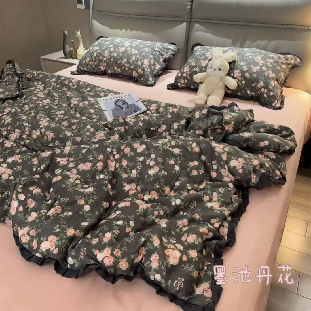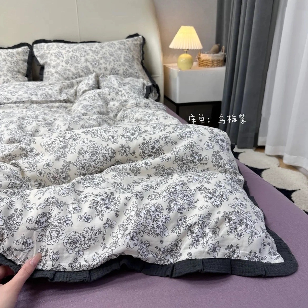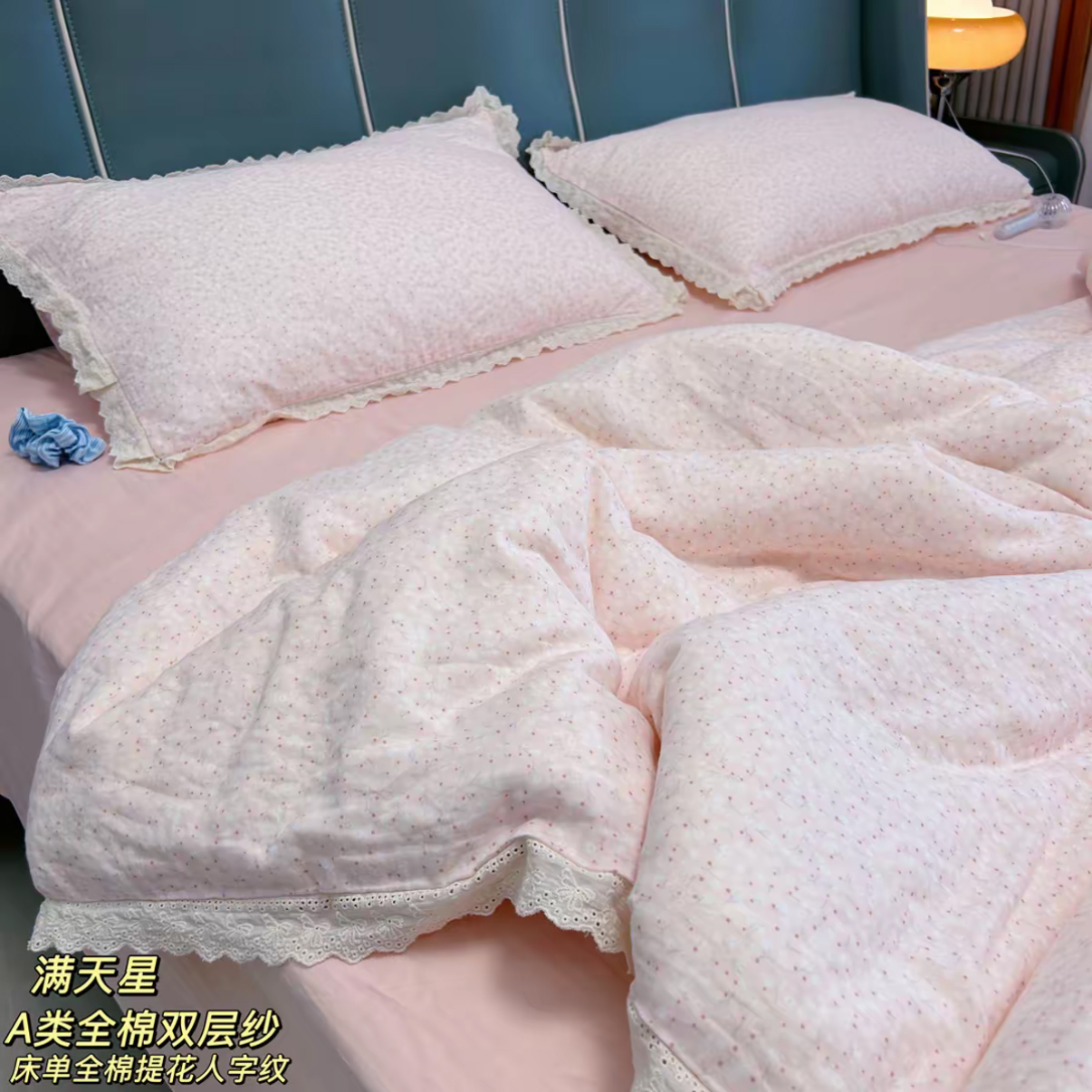 A类母婴级全棉双层纱床上四件套法式皱皱花边纯棉被套床单三件套
